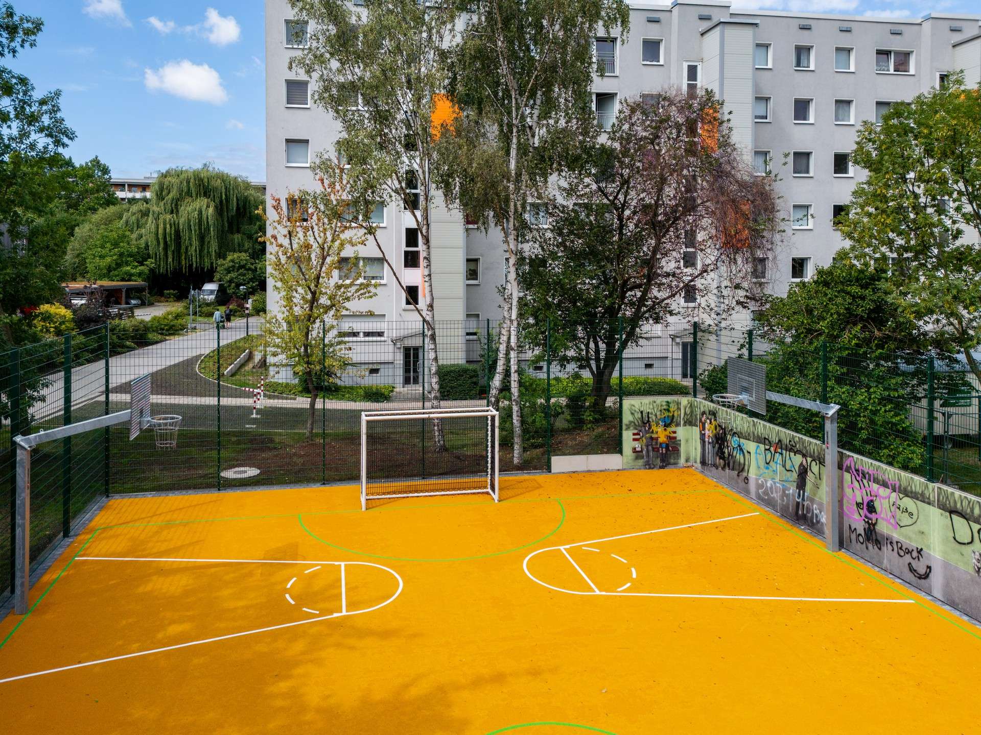 Der Bolzplatz am Spartenweg in Gorbitz wurde umfassend modernisiert: Der alte, abgenutzte Belag wurde durch einen wasserdurchlässigen Spielfeldbelag in leuchtendem Gelb ersetzt, der wetterbeständig und langlebig ist. Der neue, geräuschdämpfende Ballfangzaun sorgt für weniger Lärmbelästigung. Die beiden Fußballtore wurden im Sinne der Nachhaltigkeit wiederverwendet. Neue sportliche Herausforderungen bieten zwei zusätzlich installierte Basketballkörbe. Geplant ist noch, die angrenzende Betonmauer neu zu gestalten, um den Platz optisch abzurunden.