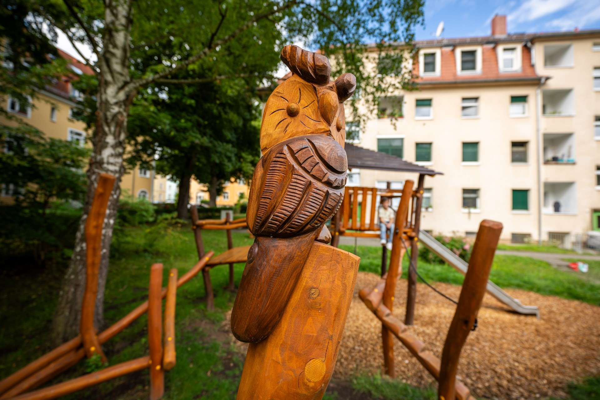 Im Innenhof zwischen Malterstraße und Deubener Straße hat sich einiges verändert – wo vorher nur Wiese die Fläche bedeckte, ist ein lebendiger Ort zum Spielen und Begegnen entstanden.