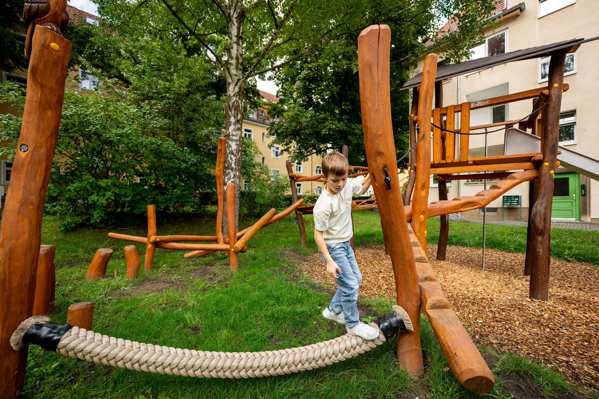 Drei Spielbereiche verteilen sich in dem großen Innenhof: ein Sandkasten mit Spielhäuschen für die Kleinen, eine Doppelschaukel und eine Kletter-Balancier-Strecke mit kleiner Rutsche. Alles aus robustem, natürlichem Material – funktional, aber liebevoll gestaltet. Schon bei der Planung war Fingerspitzengefühl gefragt. Viele der Mieter wünschten sich einen Spielplatz – andere hatten Sorge vor Lärm. Die Lösung: Ein gemeinsamer Workshop mit den Anwohnern. Sie wählten selbst den Siegerentwurf und bestimmten mit über Design und Aufbau 😃.